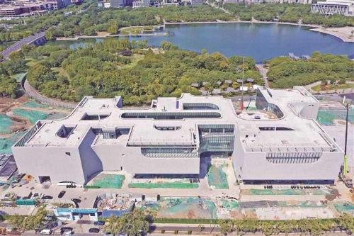 從空中俯瞰無錫美術(shù)館,其形似太湖石的建筑造型已躍然于尚賢湖畔。內(nèi)部設(shè)計(jì)也透露出濃厚的藝術(shù)氣息。