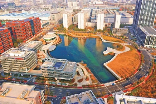 在現(xiàn)場,記者看到了一幅產(chǎn)業(yè)與生態(tài)相融共生的美好畫卷:產(chǎn)業(yè)載體的玻璃幕墻與鋼鐵交織的冷硬質感,被溫潤的湖水悄然“融化”;小三五成群在湖面上悠然“踱步”,戴勝鳥在岸邊發(fā)出“咕咕—咕咕—咕咕”的鳴唱;景觀廊道上還能看到孩子們歡快玩耍的身影……