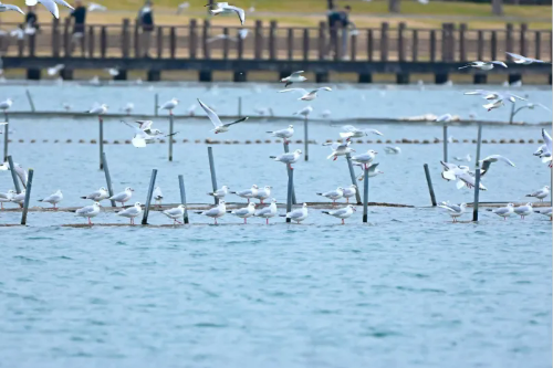在太湖沿岸,成群結(jié)隊(duì)的候鳥成為冬日里最亮眼的風(fēng)景。調(diào)查記錄顯示,數(shù)以萬計(jì)的紅嘴鷗以浩蕩之勢(shì)聚集于黿頭渚及蠡湖等地,它們潔白的羽翼與碧波相映成趣,宛如冬日信使,為濱湖注入無限生機(jī)。